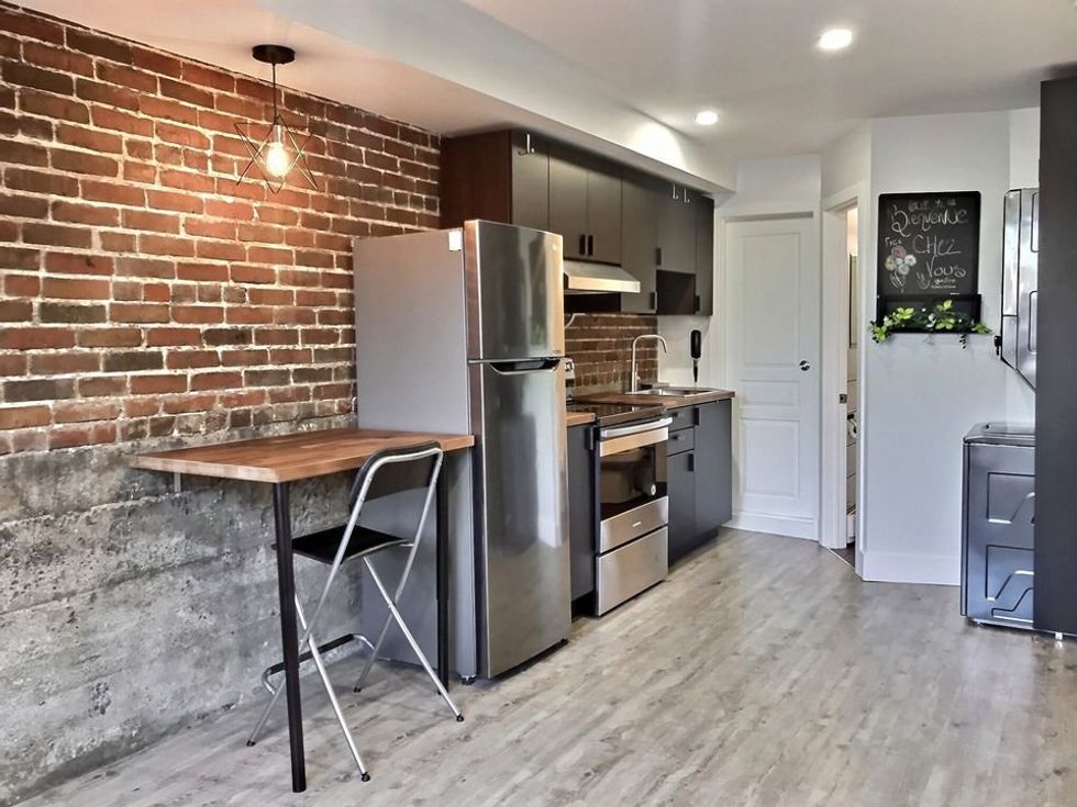 Description : Ce studio au look industriel avec son mur de béton et de briques a tout pour plaire aux jeunes professionnels qui veulent être au coeur de l'action tout en ayant un brin d'intimité et sans se ruiner. Situé au rez-de-jardin de l'immeuble, le prix inclut l'électricité, le chauffage, le wifi illimité et les électroménagers.
