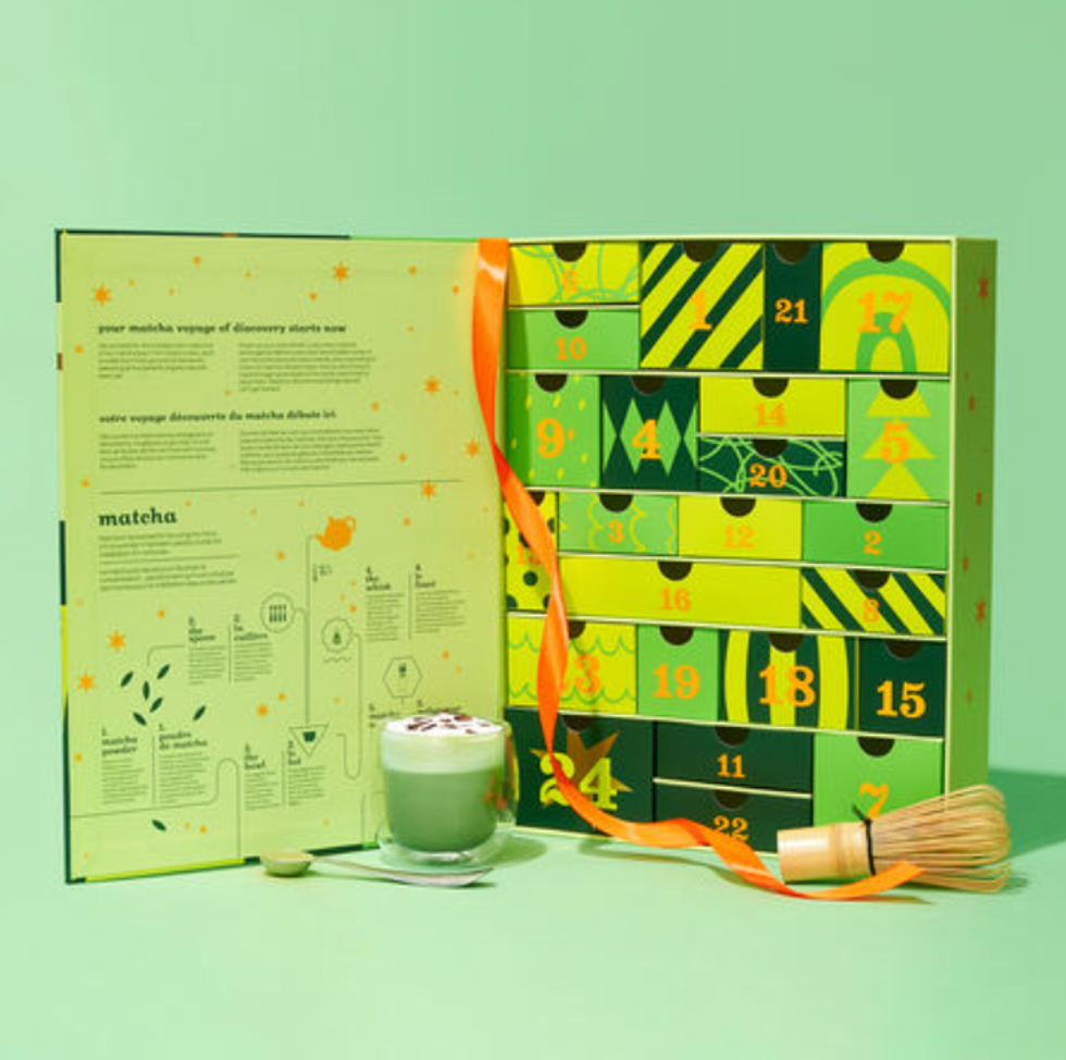 Détails : Ceux et celles qui préfèrent le matcha peuvent aussi s'offrir un calendrier 100 % matcha à toutes les saveurs : matcha au pain d'épices, à la canne de bonbon, aux baies à la crème et au caramel salé ne sont que des exemples du party de saveurs que tu auras dans la bouche.