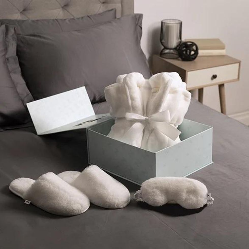 Ce coffret contient absolument tout ce qu’il faut pour se préparer à un sommeil réparateur. Chaque boîte de Dormez-vous contient un peignoir en MicroPlush, une paire de pantoufles en fausse fourrure en MicroPlush et un masque pour les yeux en fausse fourrure en MicroPlush de couleur blanche.