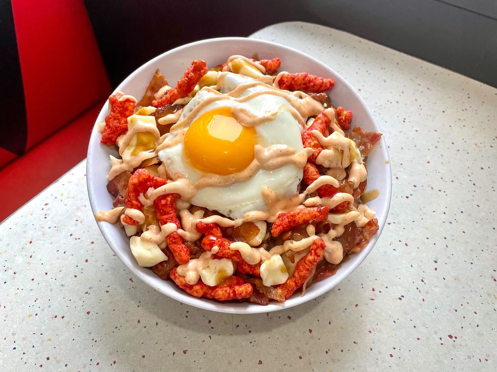 Pourquoi tu dois y goûter : Boeuf Angus, bacon, oignons caramélisés, sauce poivrée, Cheetos enflammé, oeuf bien coulant et le tout associé à une sauce sud-ouest un brin épicée. Une fusion originale et intrigante à tester.