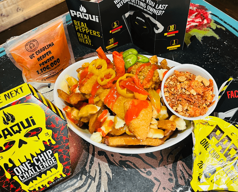 Pourquoi tu dois y goûter : Tu cherchais la poutine qui te sortira de ta zone de confort? La voilà! La poutine du resto Le Gras Dur t'offre une combinaison complètement éclatée avec des bouchées de Mac n cheese frites, des chips Takis Fuego et Challenge Paqui ainsi que des arachides à l'aneth écrasées. Et pour finir ta bouchée fumante, des piments jalapenos et de la sauce Sriracha. Ça s'annonce caliente.