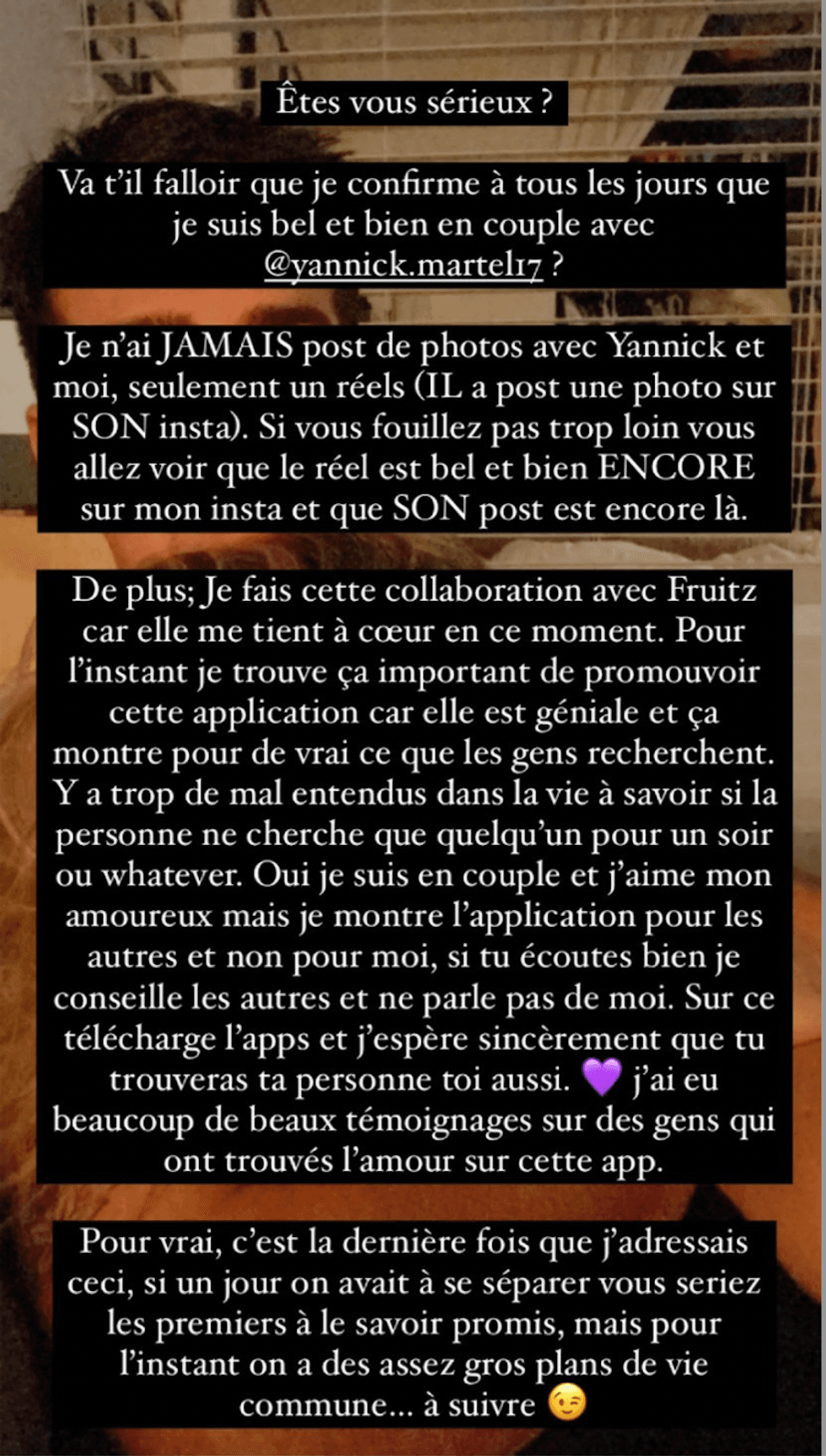 « Êtes-vous sérieux? Va-t-il falloir que je confirme à tous les jours que je suis bel et bien en couple avec Yannick? Je n'ai jamais post de photo avec Yannick et moi, seulement un reel (IL a post une photo sur SON Insta). Si vous fouillez pas trop loin, vous allez voir que le reel est bel et bien ENCORE là sur mon Insta et que SON post est encore là. De plus, je fais cette collaboration avec Fruitz, car elle me tient à coeur en ce moment. »