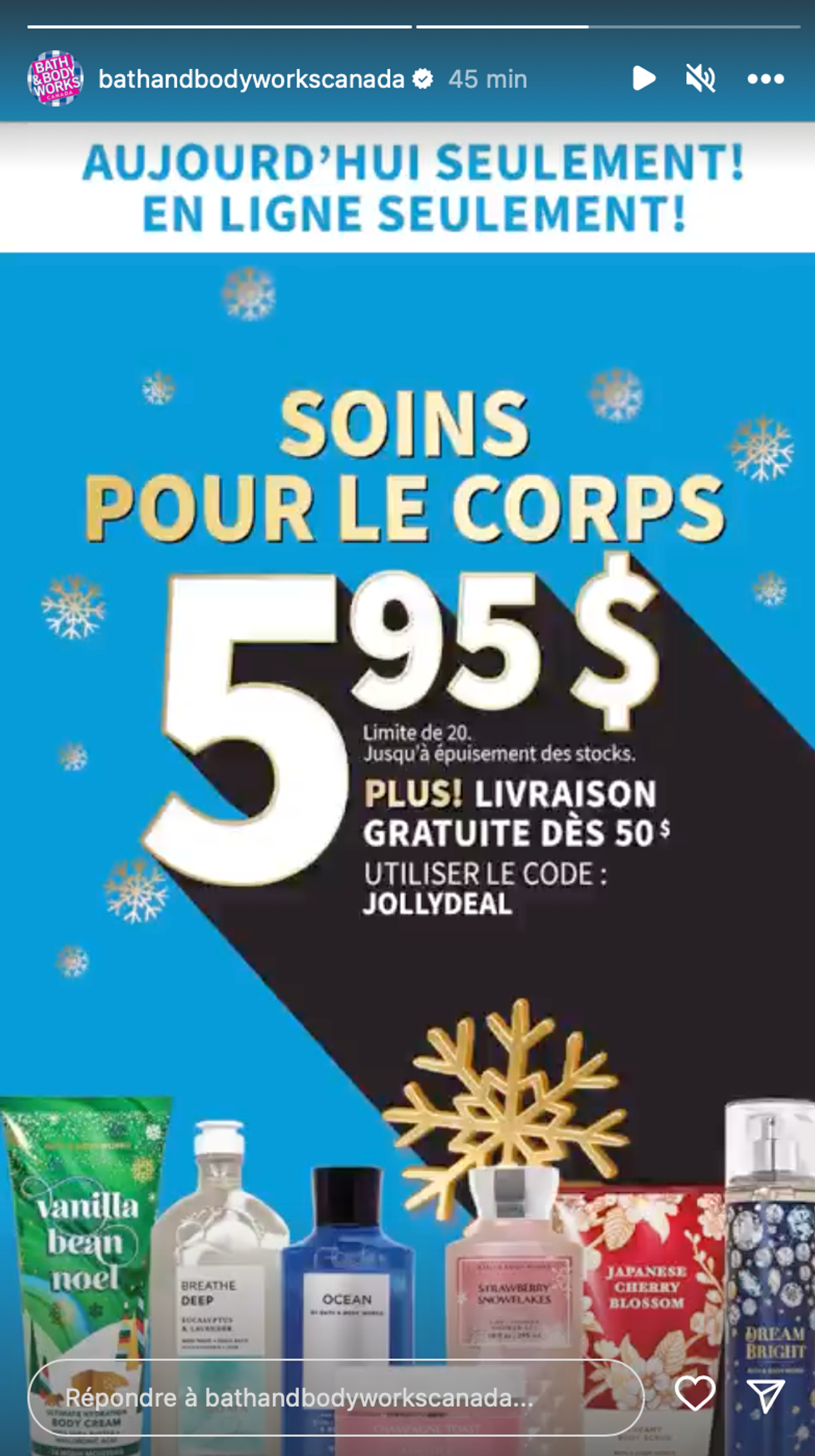 Les soins pour le corps sont donc à 5,95 $ pour une limite de 20 items par personne. Tu peux donc acheter des brumes parfumées, des crèmes hydratantes ou encore des nettoyants pour le corps. Pour profiter de l'offre, il suffit d'utiliser le code promotionnel JOLLYDEAL lorsque tu passes commande.