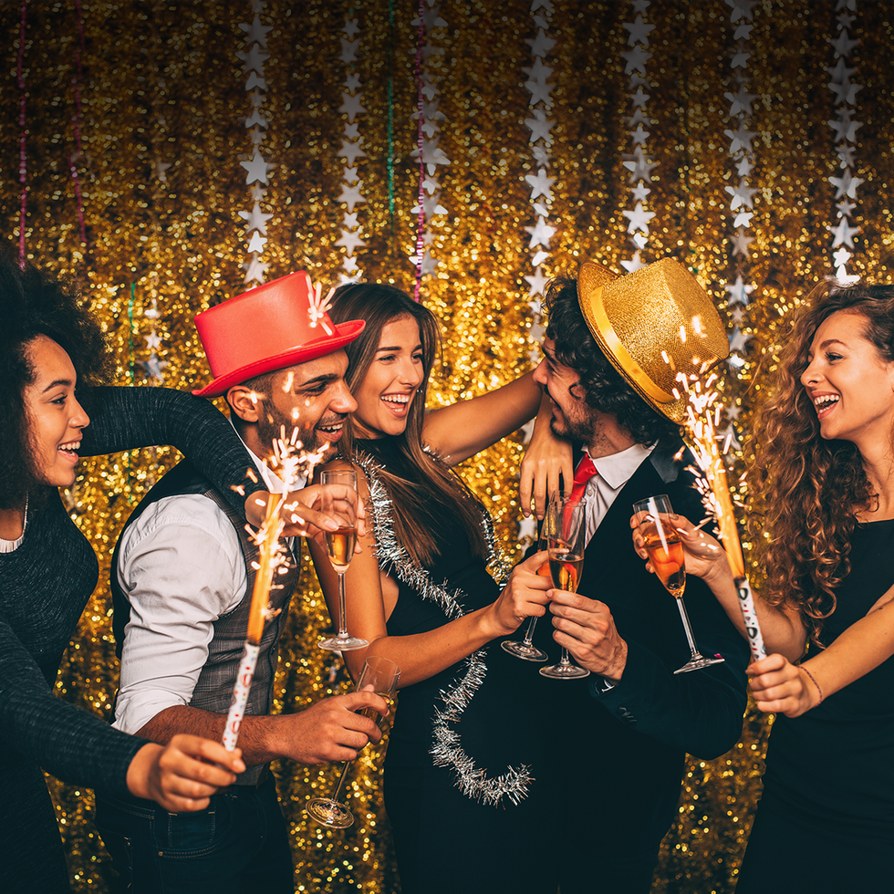 Sans t’en rendre compte, il est déjà 23 h 45 et tu attrapes quelques accessoires distribués sur place afin d'être prêt.e à prendre ton dernier selfie de l'année.