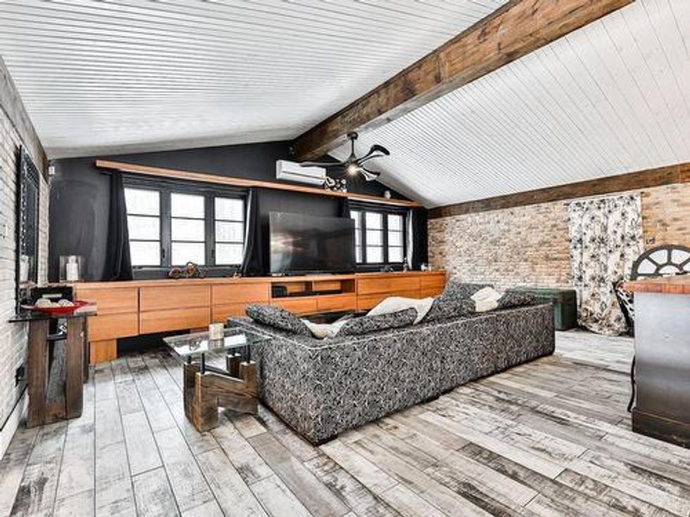Rénové en 2016, le premier étage est complètement à aire ouverte et avec les nombreuses fenêtres, la lumière pénètre très facilement. Les poutres de couleurs foncées aux plafonds ainsi que les murs en pierre apportent un contraste avec l'aspect plus moderne de la demeure.