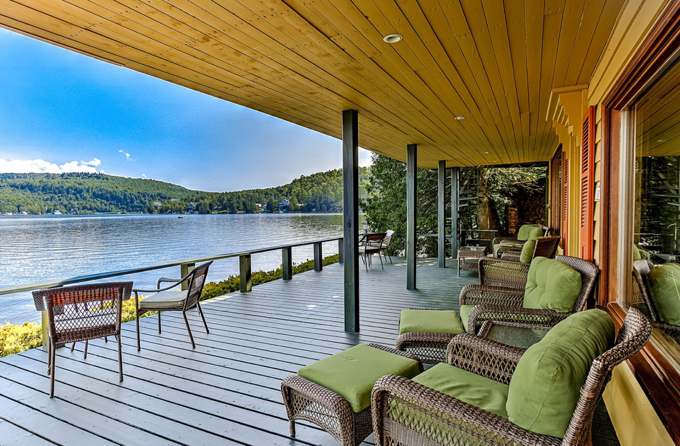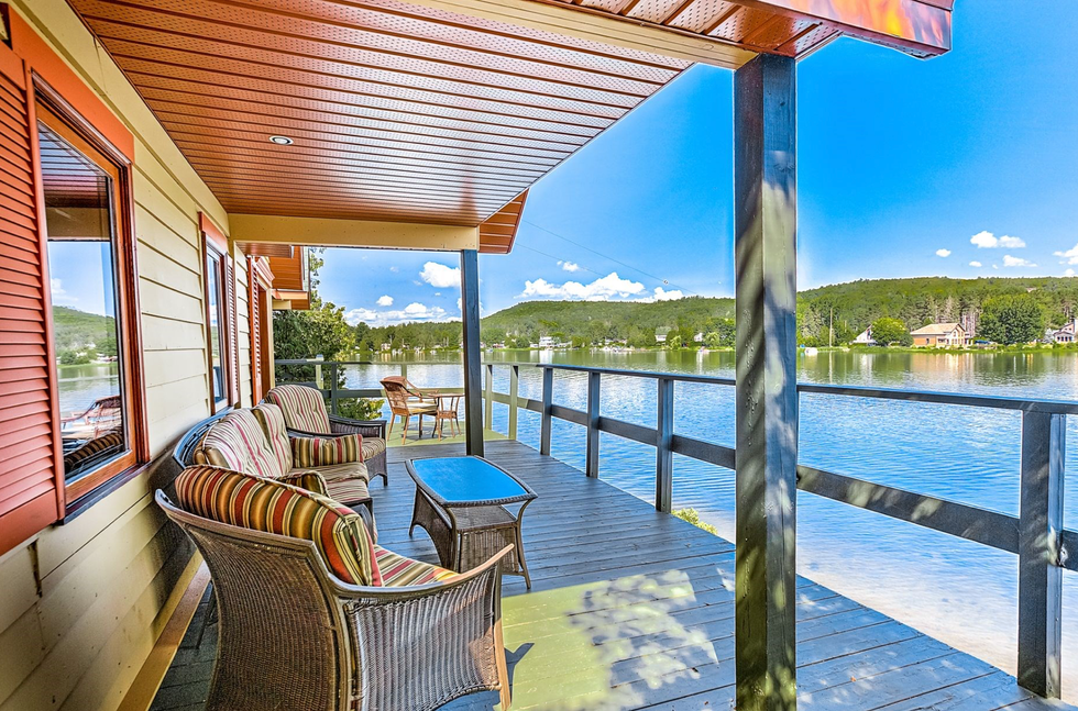 Tu pourras avoir une vue panoramique sur le lac constante que ce soit de la terrasse ou en extérieur puisqu'il y a deux grandes fenêtres dans le salon.