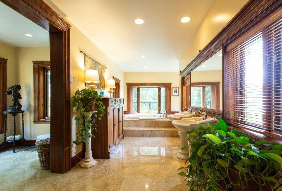Et une salle de bain magnifique, avec une baignoire en marbre qui donne la vue sur le bois.