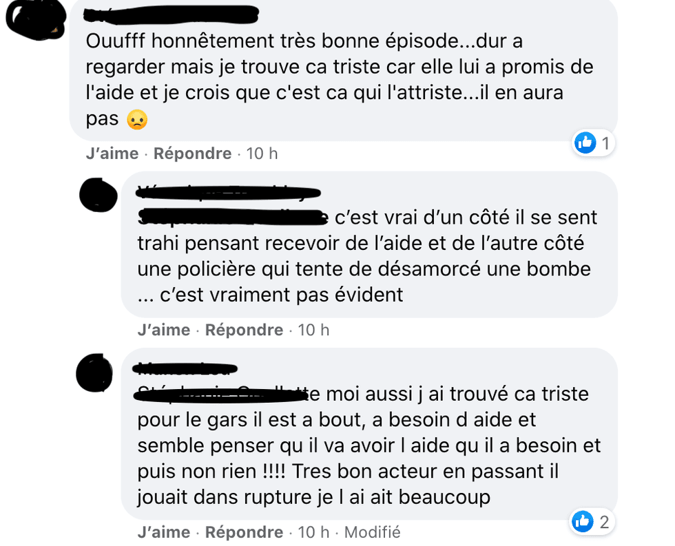 Plot Twist : la sergente-détective Florence Guindon connait le couple et décide de s’en mêler. Sans vouloir divulgâcher personne, tout est bien qui finit bien, mais il y a un coût à tout et le dénouement a fait beaucoup réagir.