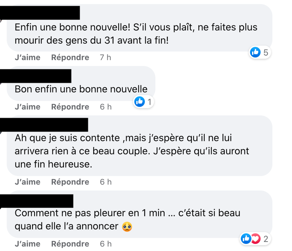 « Ah que je suis contente, mais j'espère qu'il ne lui arrivera rien à ce beau couple. J'espère qu'ils auront une fin heureuse », a écrit cette internaute. Une autre a même supplié la production : « S'il vous plaît, ne faites plus mourir des gens du 31 avant la fin! »