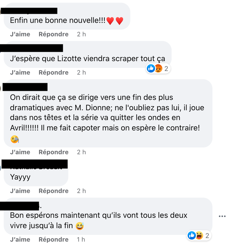 « On dirait que ça se dirige vers une fin des plus dramatiques avec M. Dionne; ne l'oubliez pas lui, il joue dans nos têtes et la série va quitter les ondes en Avril!!!!!! Il me fait capoter mais on espère le contraire! », a lancé ce téléspectateur qui n'ose pas croire en une fin heureuse.
