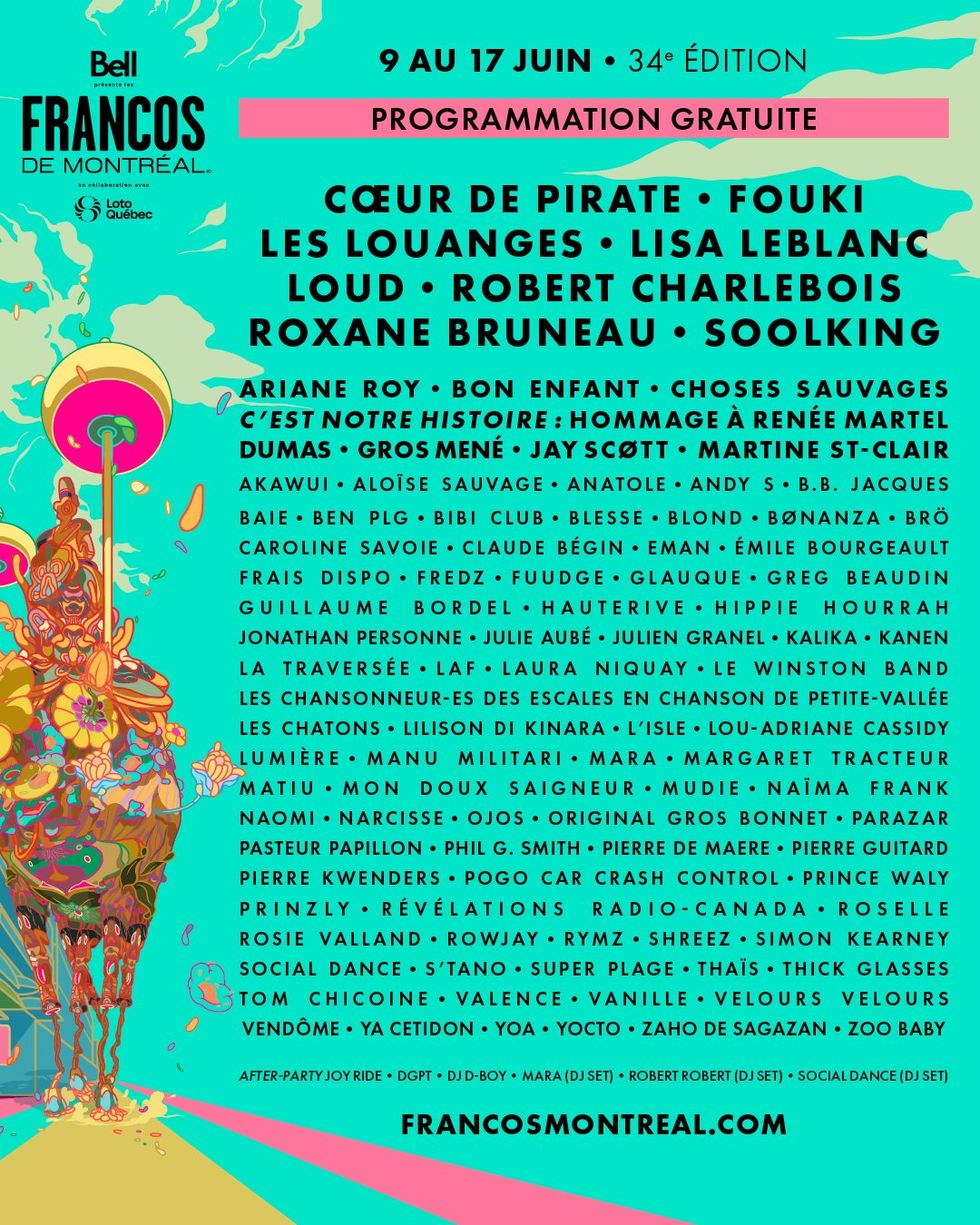 Le Quartier des spectacles, au centre-ville de Montréal, dansera au rythme du festival à partir du 9 jusqu'au 17 juin. Rendu à sa 34e édition, les Francos qui donnent le ton à l'été et proposent de nombreux événements gratuits. « Joignez-vous à ce beau délire célébrant toute la diversité de la chanson francophone. Que la fête commence ! », a lancé le directeur de la programmation, Maurin Auxéméry, par voie de communiqué.