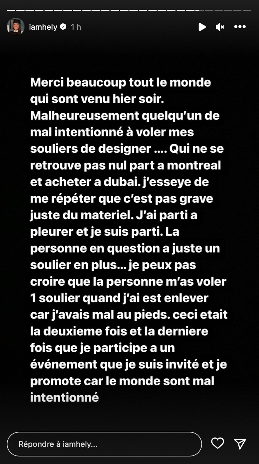 « Merci beaucoup tout le monde qui sont venus hier soir. Malheureusement quelqu'un de mal intentionné a volé mes souliers de designer... Qui ne se retrouvent nulle part à Montréal et achetés à Dubaï. J'essaye de me répéter que ce n'est pas grave juste du matériel. [...] La personne en question a juste un soulier en plus... Je ne peux pas croire que la personne a volé un soulier quand je les ai enlevés, car j'avais mal aux pieds », commence d'abord par expliquer la star d'OnlyFans.