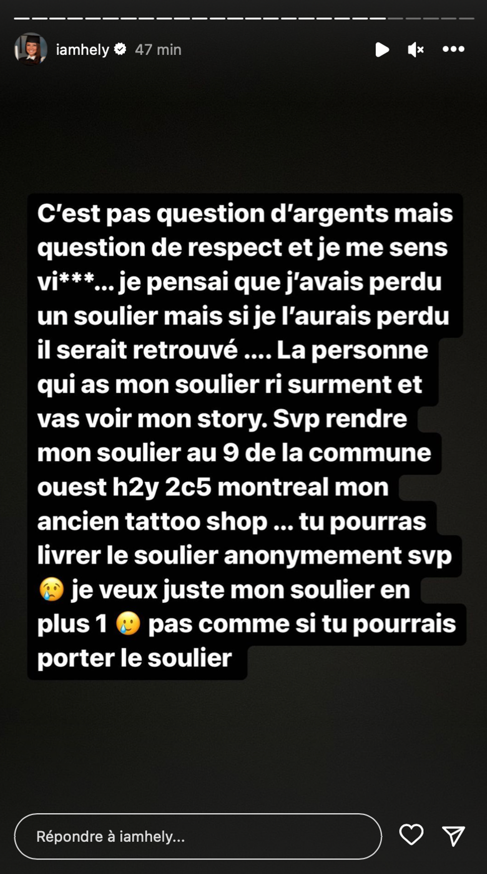 « C'est pas question d'argent mais question de respect et je me sens vi***... Je pensais que j'avais perdu un soulier, mais si je l'avais perdu il serait retrouvé... La personne qui a mon soulier rit sûrement et va voir ma story. Svp [peux-tu] rendre mon soulier au 9 [rue] de la Commune ouest H2Y 2C5 Montréal, mon ancien tattoo shop. Tu pourras livrer le soulier anonymement svp. Je veux juste mon soulier en plus un... c'est pas comme si tu pouvais porter le soulier », a-t-elle ensuite imploré.