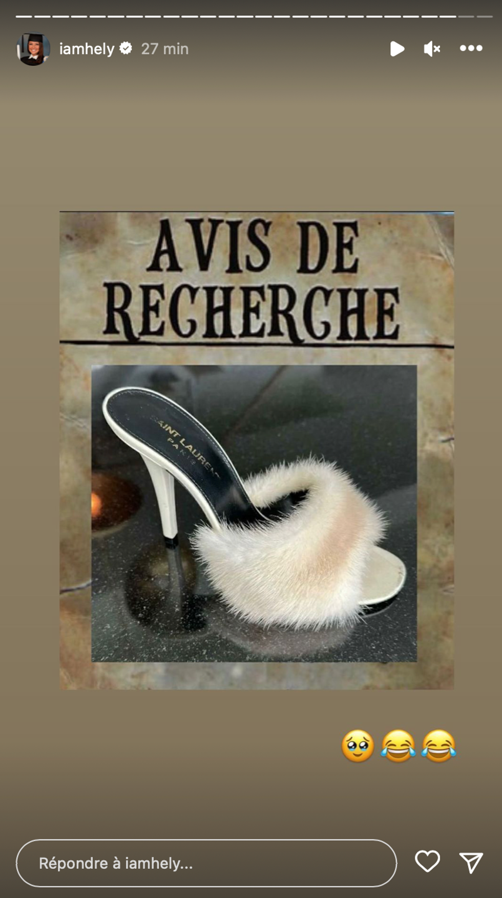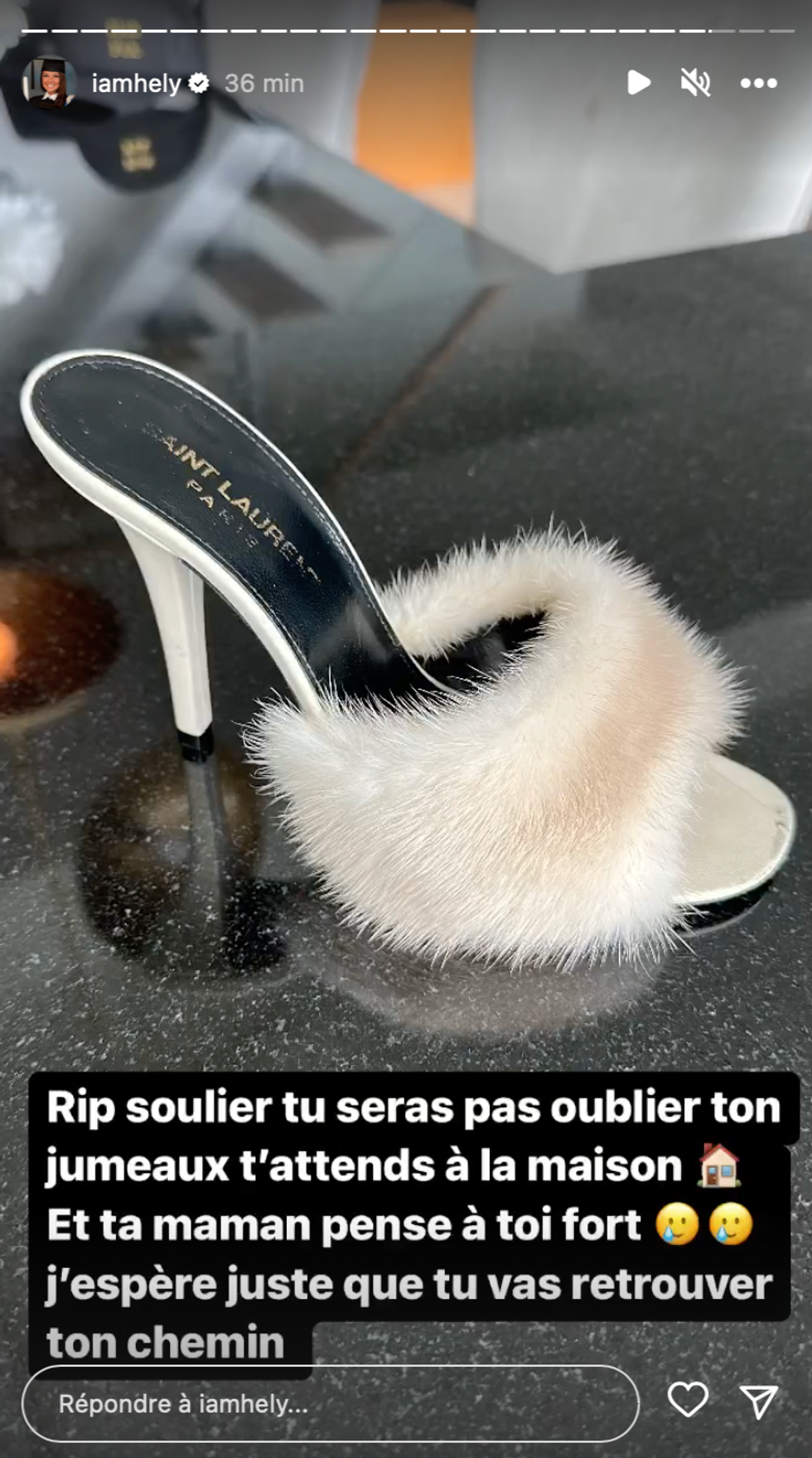 « RIP soulier tu seras pas oublié ton jumeau t'attend à la maison et ta maman pense à toi fort. J'espère juste que tu vas retrouver ton chemin », a-t-elle écrit en postant une photo de celui-ci, qui serait de la marque Yves Saint-Laurent.