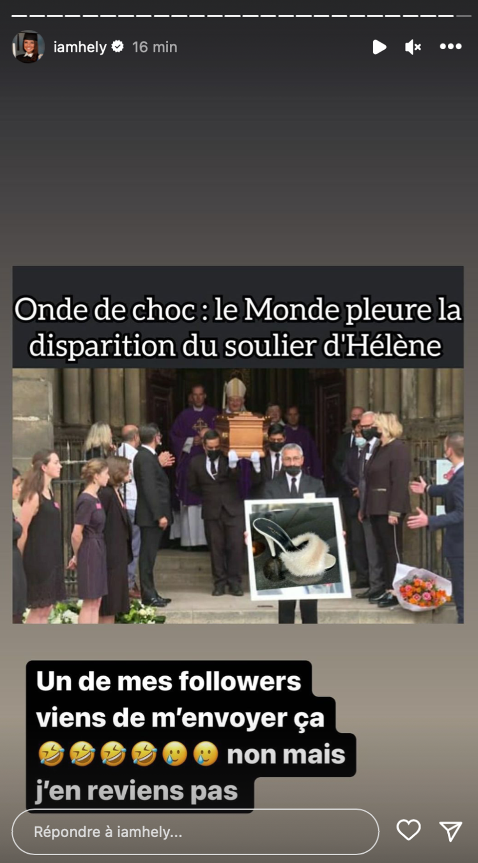 Ainsi qu'un mème réalisé par un follower dans lequel on peut lire « Onde de choc : le Monde pleure la disparition du soulier d'Hélène. »