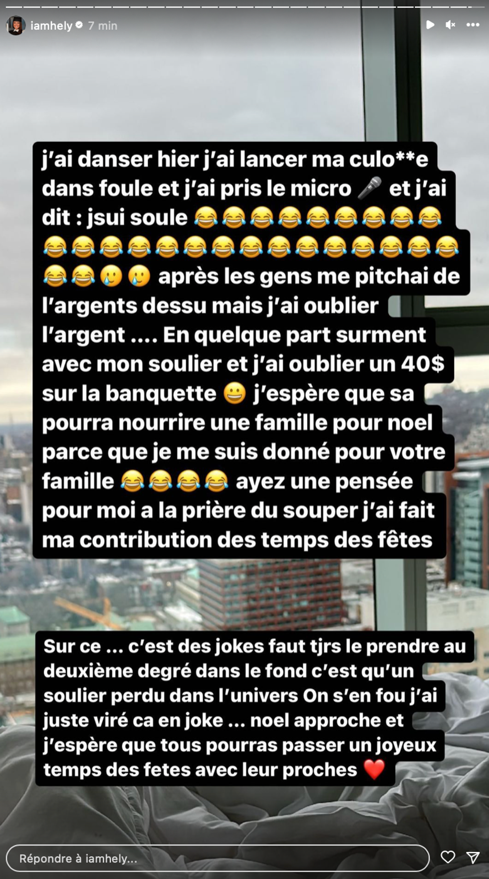 Elle a ensuite expliqué avoir été très saoule lors du party et a déclaré : « J'espère que ça pourra nourrir une famille pour Noël parce que je me suis donnée pour votre famille », avant de conclure « sur ce... c'est des joke faut toujours le prendre au deuxième degré. Dans le fond c'est qu'un soulier perdu dans l'univers. On s'en fou, j'ai juste viré ça en joke... [...] »