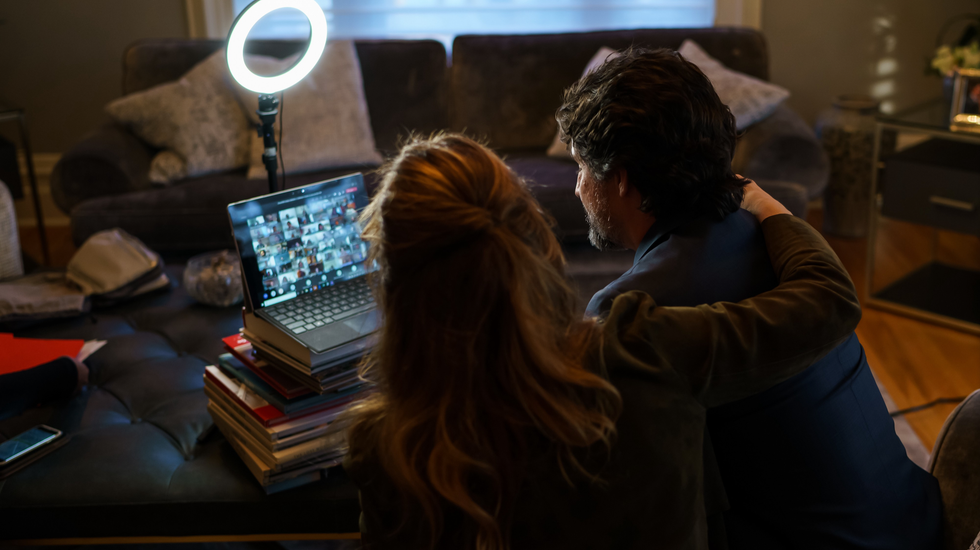 Cette photo montre le premier ministre et son épouse, Sophie Grégoire Trudeau, participant à un appel vidéo à leur domicile. On peut y voir le duo souhaiter de joyeuses Fêtes aux gens derrière l'écran.