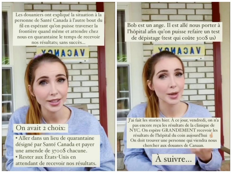 « Si on décide de retourner au Canada quand même, on a une amende de 3 700 $ et on doit aller dans une quarantaine [...] l'autre solution qui s'offre à nous c'est de retourner aux États-Unis en attendant d'avoir nos tests, mais là ça a été plus compliqué que prévu parce qu'à un certain moment les USA ne voulaient pas nous reprendre. »