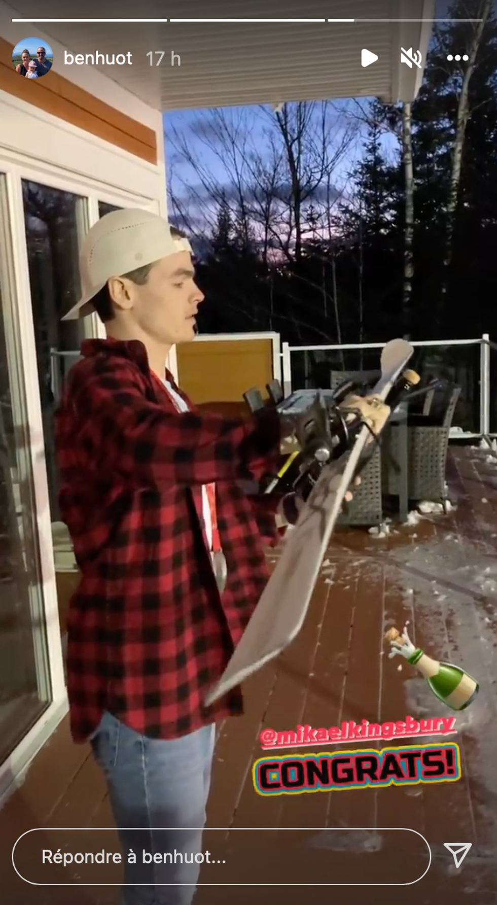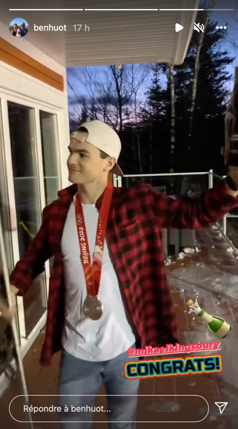 C'est dans la story Instagram du paralympien Benoît Huot, qui a remporté 20 médailles en cinq Jeux, que l'on peut voir Mikaël Kingsbury sabrer le champagne de la manière la plus québécoise qu'il soit. L'athlète porte une chemise de bûcheron et ouvre sa bouteille avec son ski, alors qu'on peut voir le soleil se coucher et la neige qui empiète sur le balcon.