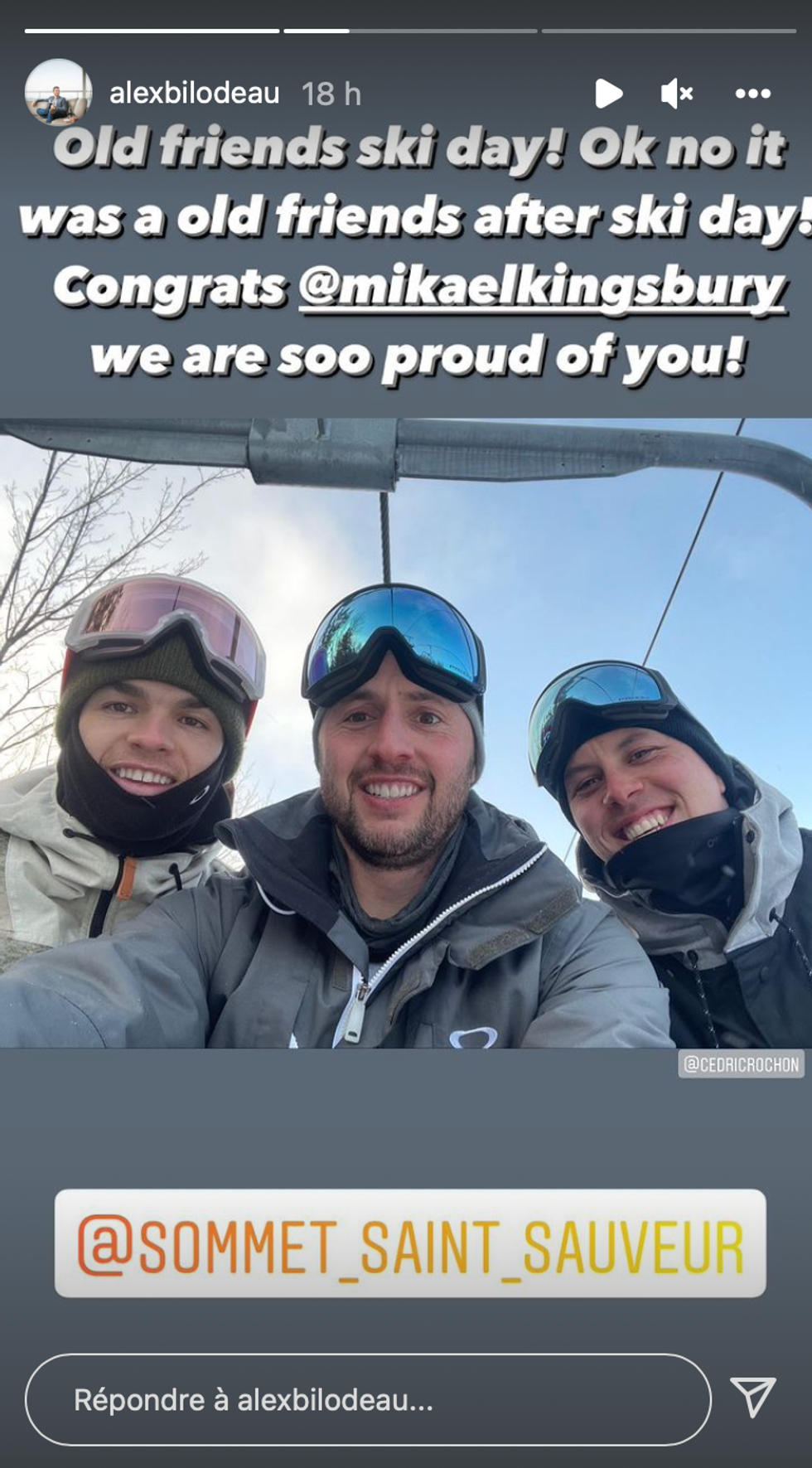 Alexandre Bilodeau, un skieur acrobatique et olympien, a également indiqué être avec Mikaël Kingsbury à son retour au Québec. Ils auraient skié ensemble une journée au Sommet Saint-Sauveur. Il était également présent au moment du champagne, selon sa story Instagram.