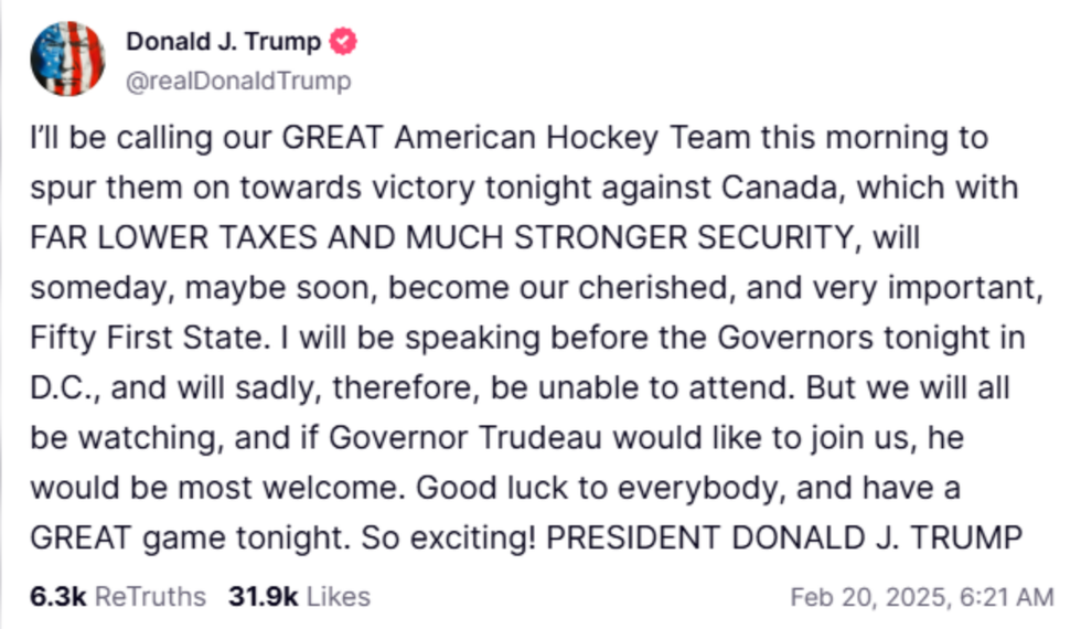 « Ce matin, j’appellerai notre GRANDE équipe américaine de hockey pour les encourager vers la victoire contre le Canada. Avec ses IMPÔTS BIEN PLUS BAS et une SÉCURITÉ BIEN PLUS FORTE, le Canada deviendra peut-être, un jour, et peut-être bientôt, notre très cher et très important 51ᵉ État.