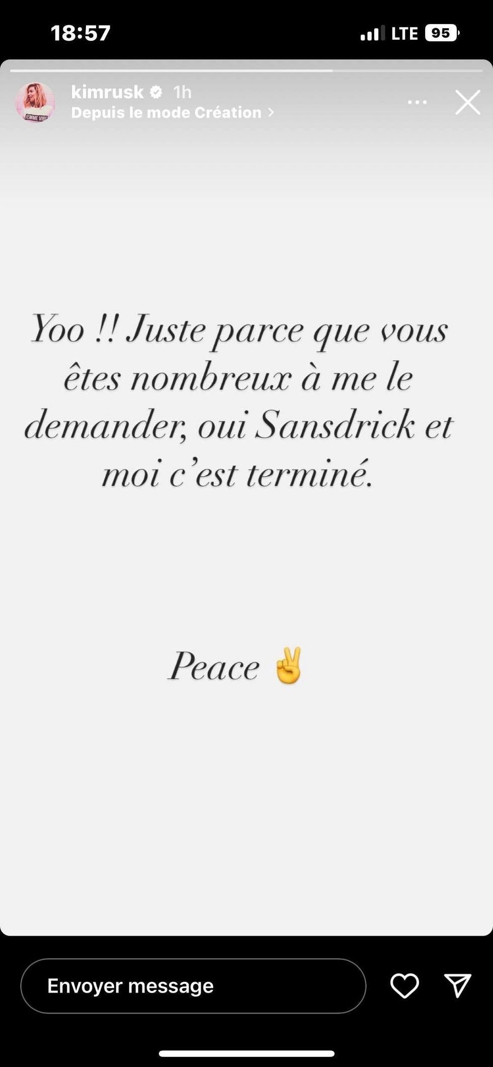C’est dans une story partagée sur son compte Instagram, ce 9 décembre, que Kim Rusk en a fait l’annonce de manière assez brève et directe : « Yo, juste parce que vous êtes nombreux à me le demander, oui, Sansdrick et moi c’est terminé. Peace. »