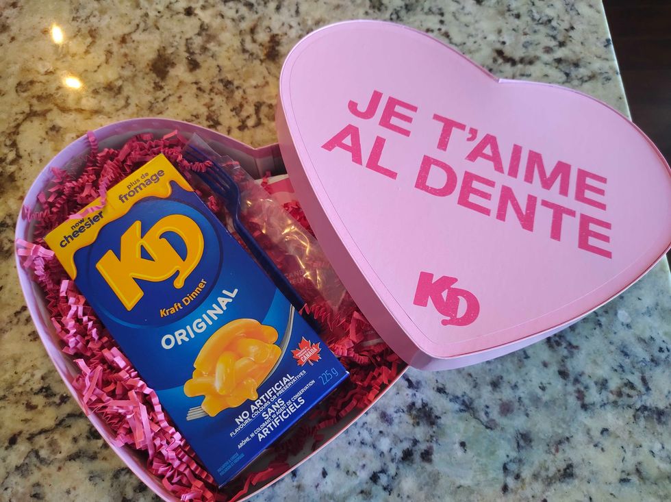 Voulant se démarquer pour la Saint-Valentin, Kraft Dinner a lancé une nouvelle édition limitée de son traditionnel macaroni au fromage complètement rose : « Bonbon KD ».