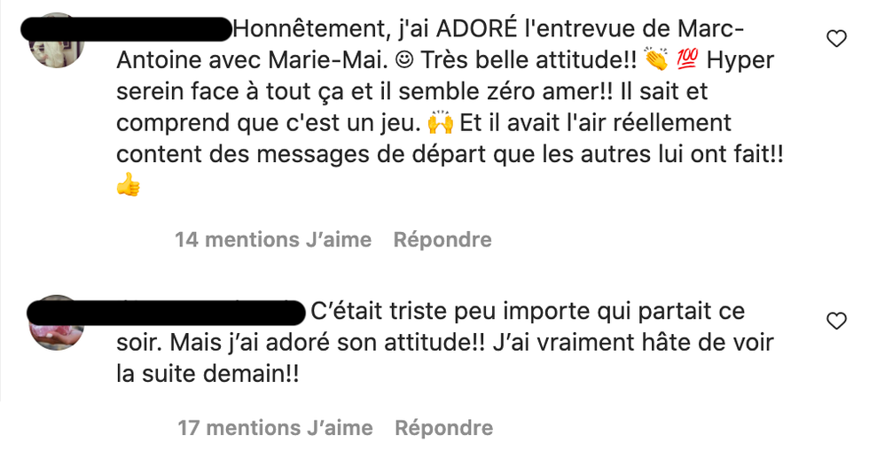 Si le départ de Marc-Antoine n'a pas plu à tous.tes, de nombreux commentaires font mention de son attitude lorsqu'il a appris qu'il était éliminé ainsi que pendant son entrevue d'exclu avec Marie-Mai. Le public a fait remarquer qu'il était un bon joueur et que sa réaction est impressionnante.