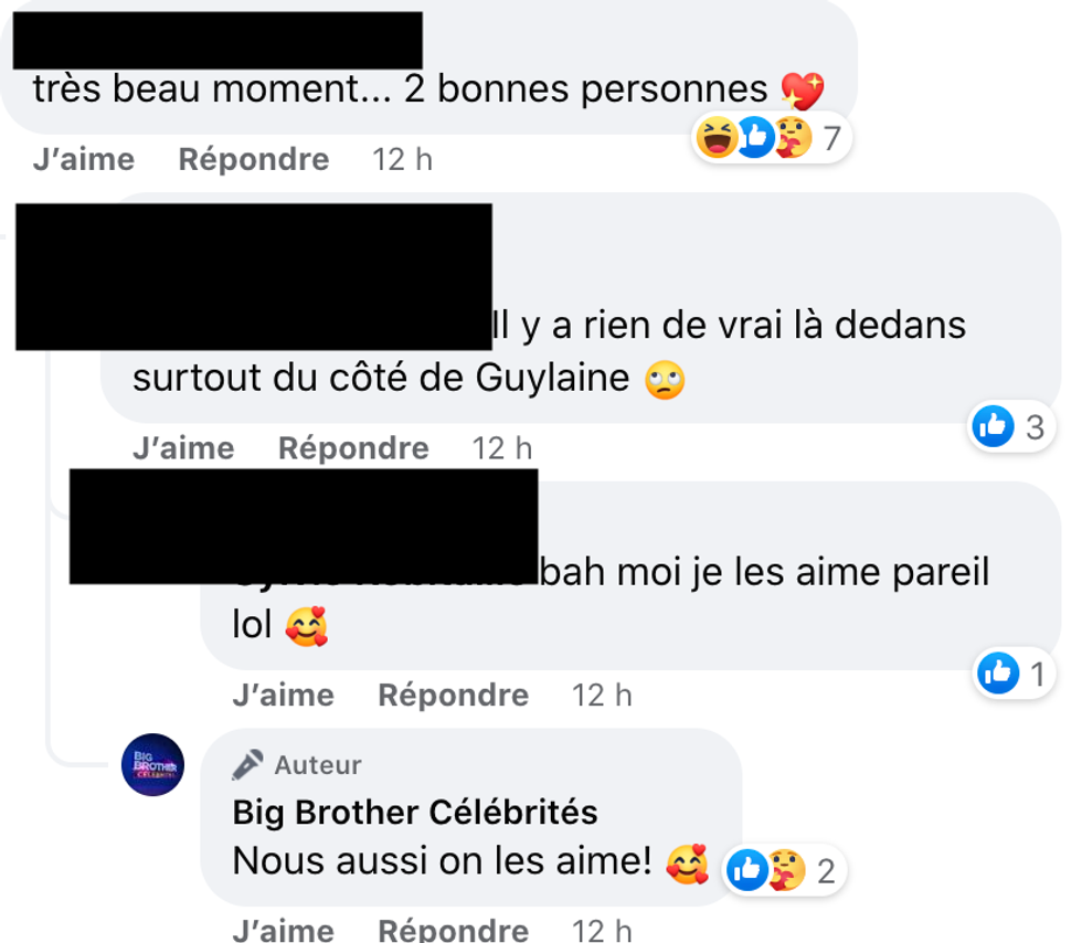 Malgré tout, ces rebondissements rendent l'émission captivante et un.e fan a tenu à spécifier que son appréciation pour les vedettes n'était pas affectée par la situation, ce à quoi les gestionnaires du compte Facebook de Big Brother ont répondu : « Nous aussi on les aime! »