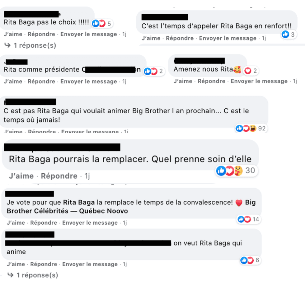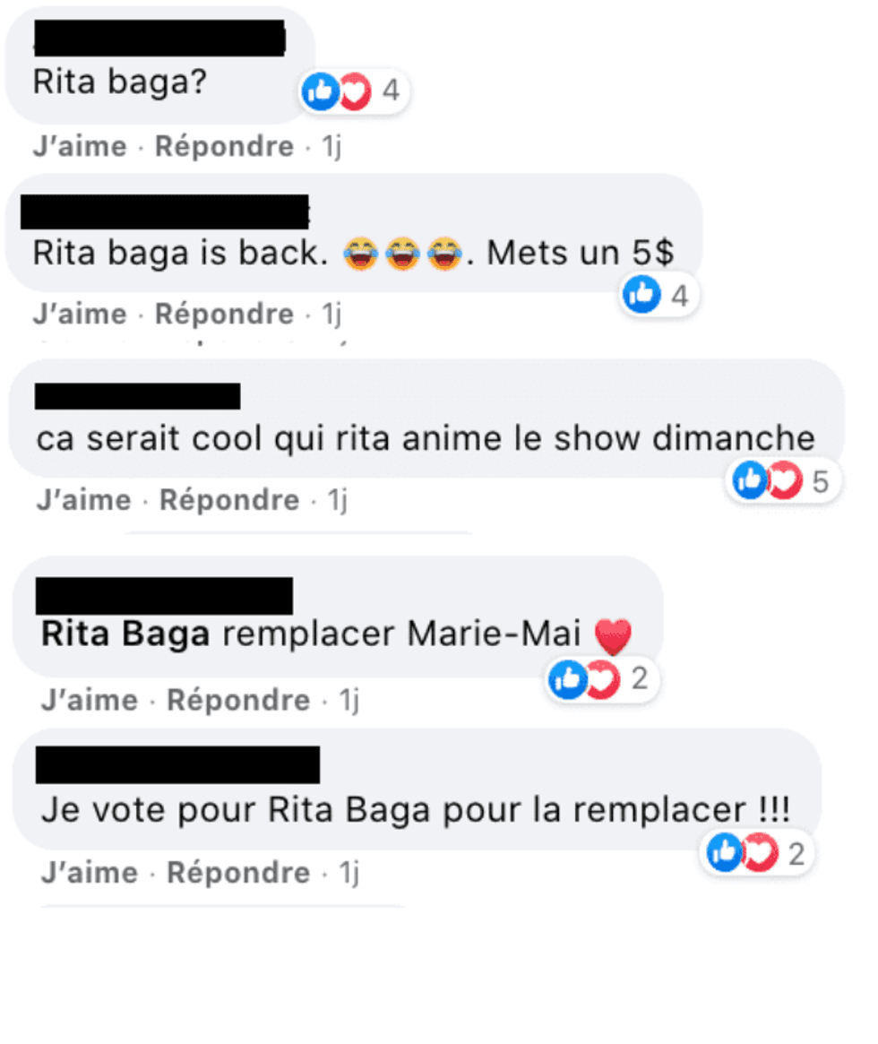 On peut lire des commentaires comme : « Rita Baga pourrait la remplacer. Qu'elle prenne soin d'elle. », ou d'autres plus directs comme « C'est le temps d'appeler Rita Baga en renfort » et « On veut Rita Baga qui anime. »