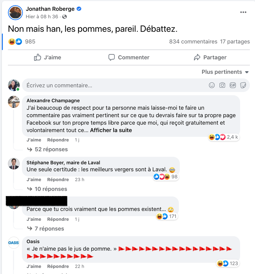 « Non mais han, les pommes, pareil. Débattez », a écrit l'acteur derrière la websérie Fiston, ce 8 février en matinée, sur Facebook. Cela n'a pas été long avant que ses abonné.es embarquent dans le gag, alors que la publication a récolté près de 850 commentaires en quelques heures seulement.