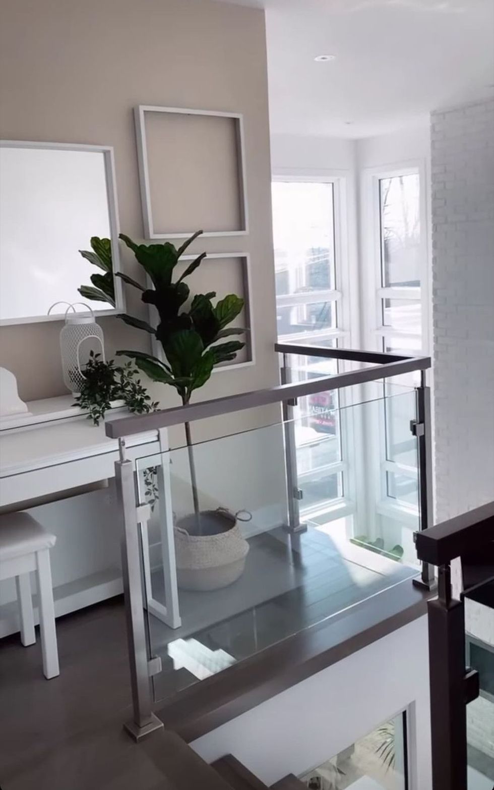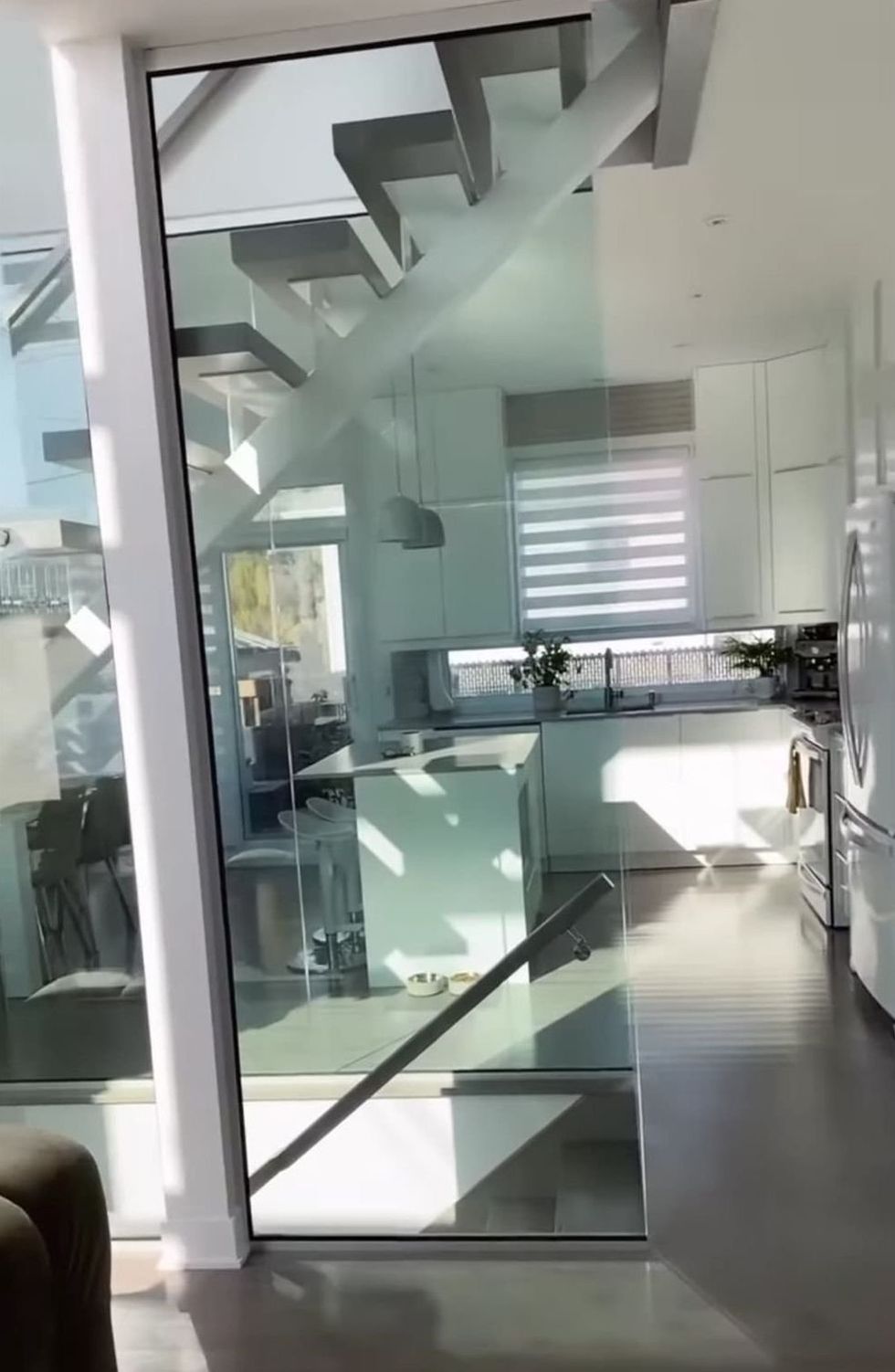 Au centre des pièces principales, soit le salon, la cuisine et la salle à manger, il y a un grand escalier vitré qui permet de créer une aire ouverte. Les espaces communs ont un style béton avec de larges fenêtres pour laisser entrer la lumière.