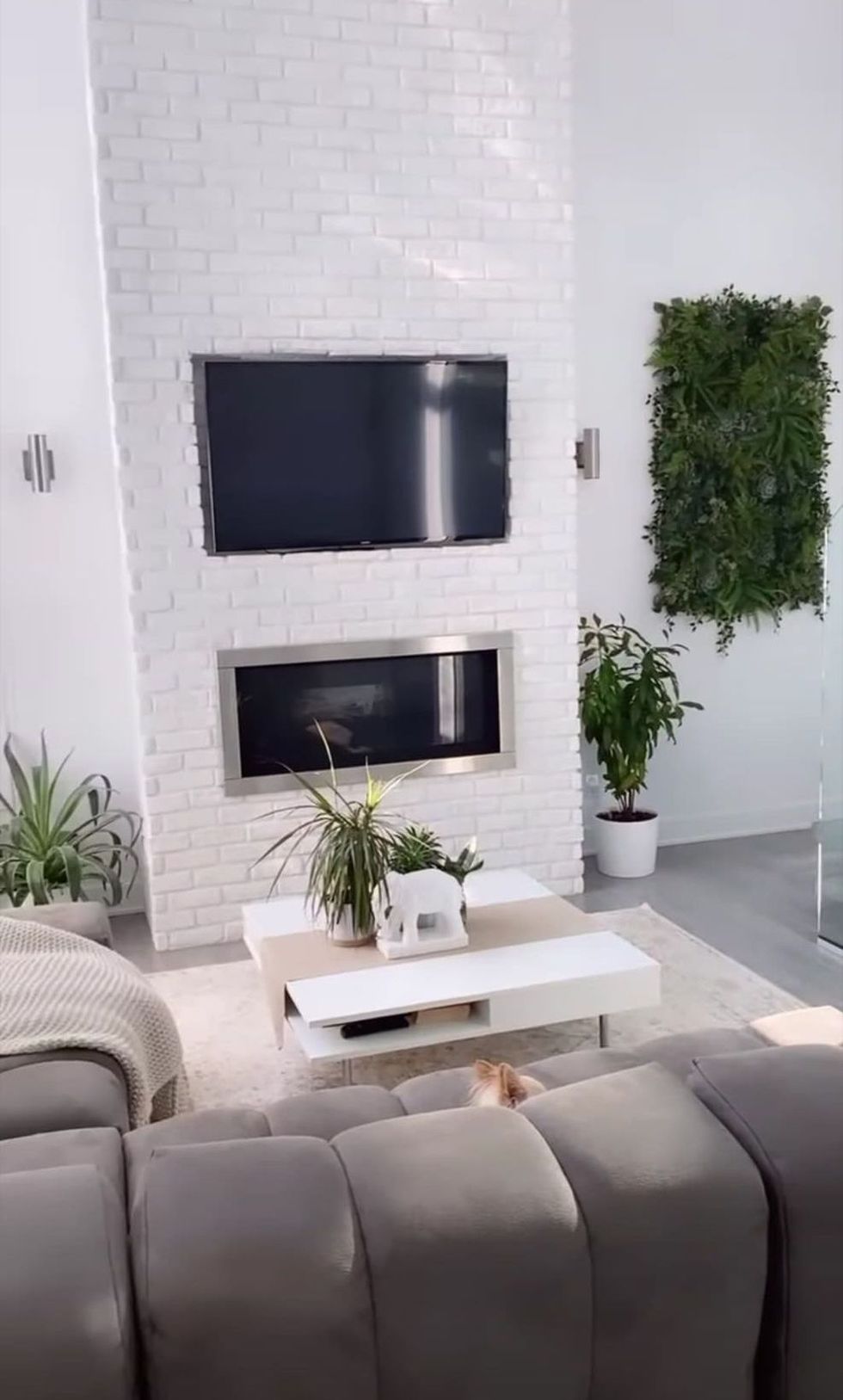 Dans le salon, on retrouve un impressionnant foyer en brique blanche avec une télévision juste au-dessus. Un large divan en « L » remplit le reste de la pièce.