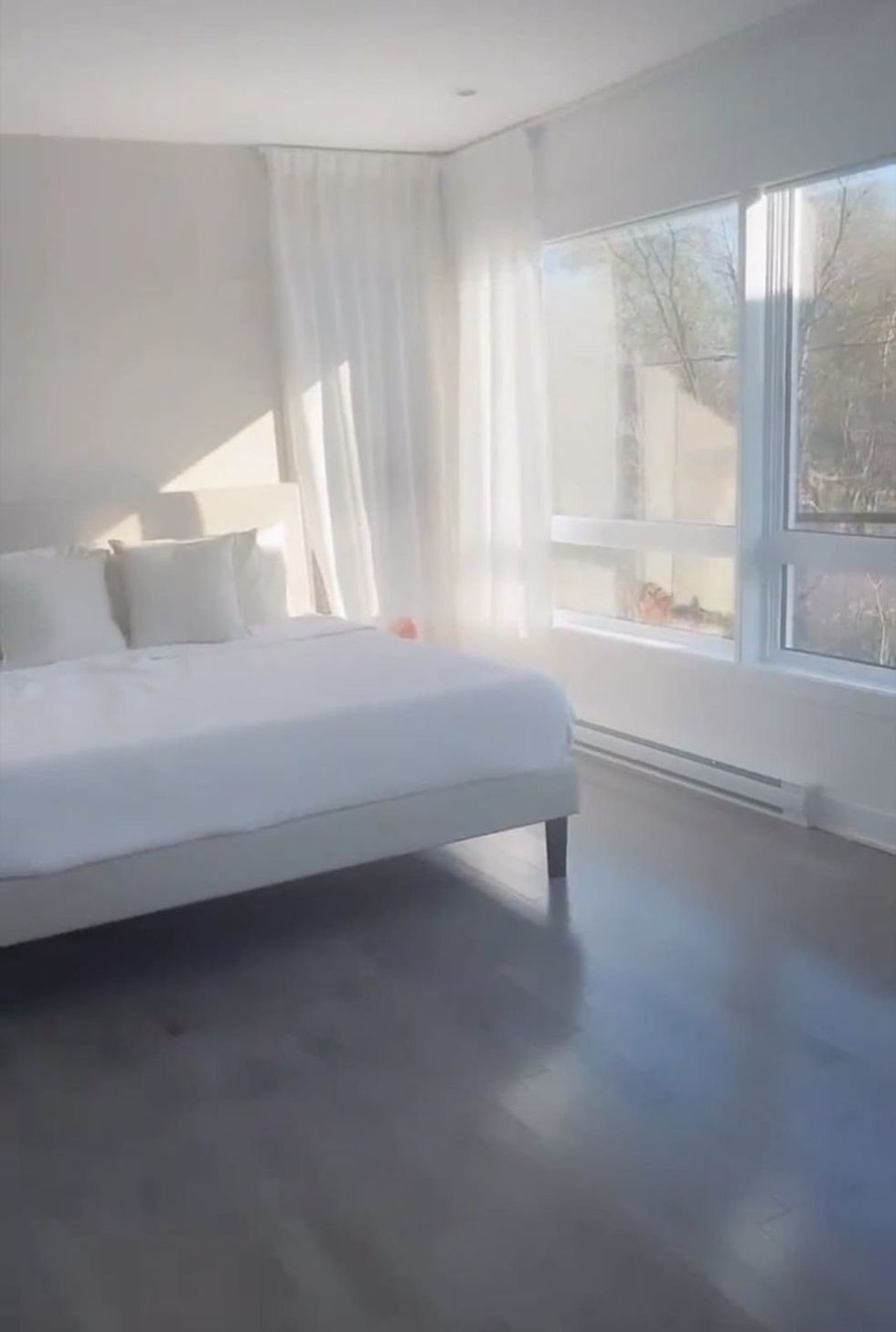 La chambre principale est vaste et plutôt minimaliste, offrant une belle vue sur le lac avoisinant. Éloïse affirme que le décor épuré lui permet de bien dormir.