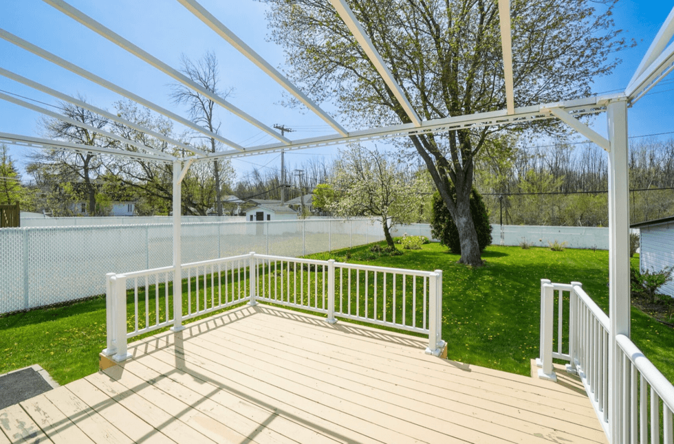 Le jardin est clôturé par une barrière et comprend une grande terrasse en bois qui sera parfaite pour organiser des barbecues avec tes personnes préférées cet été 2023.