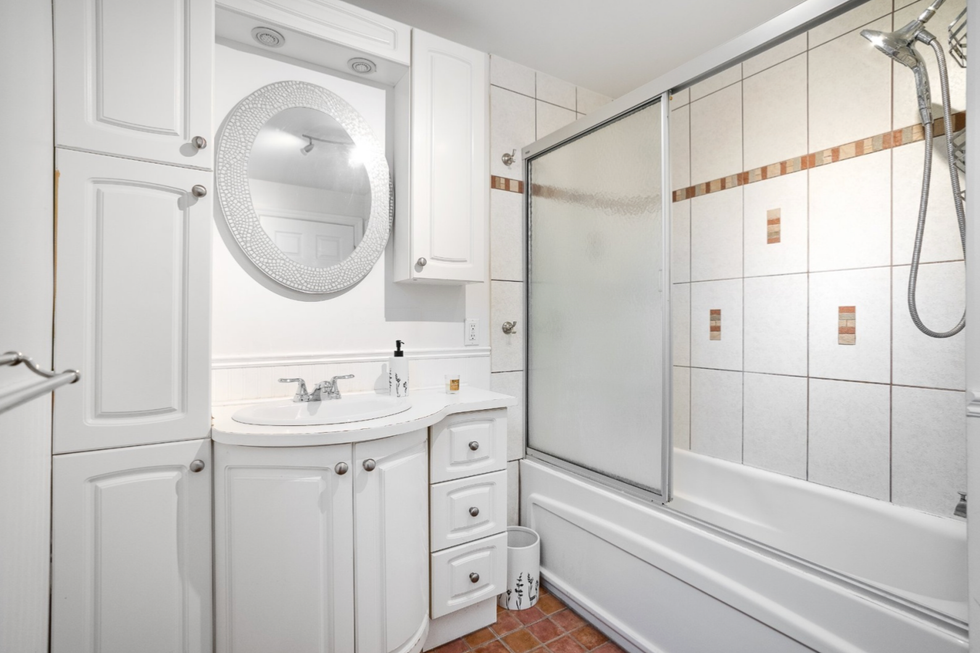 Au même niveau se trouve la salle de bain constituée de carrelage, avec une grande baignoire et plusieurs espaces de rangement.