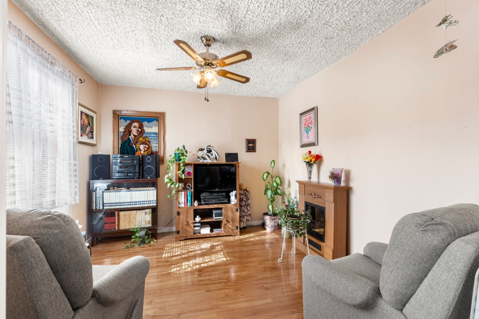 L'entrée mène à un salon qui a un revêtement en bois et une grande fenêtre, ce qui rend la pièce lumineuse. Il semble d'ailleurs avoir une cheminée, ce qui est parfait pour une ambiance ultra cozy l'hiver.