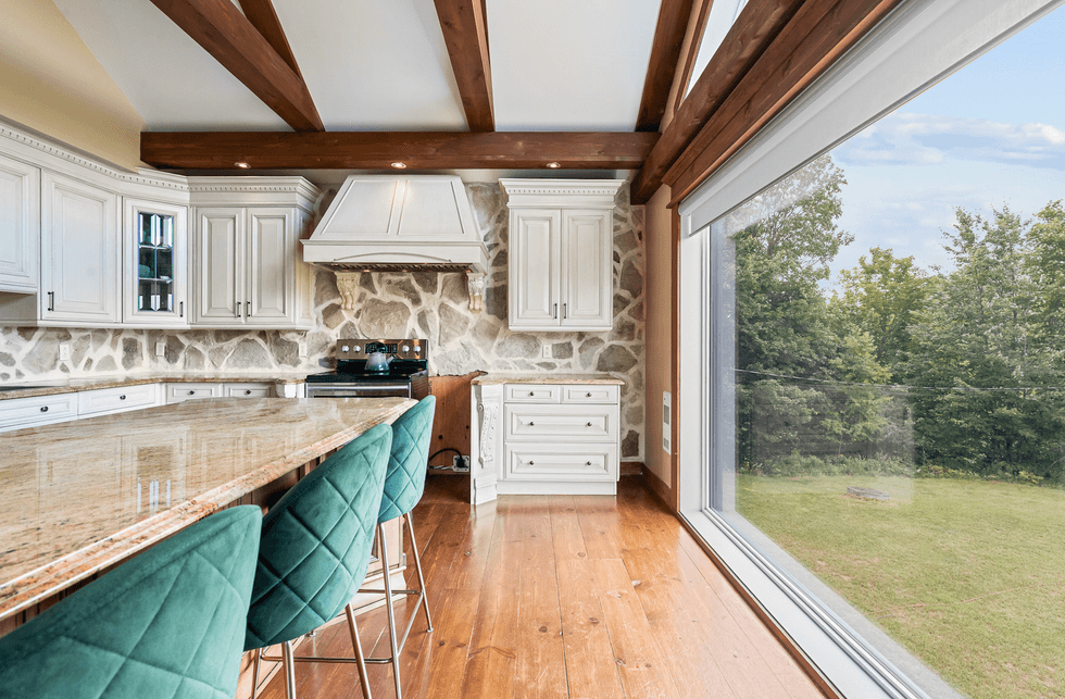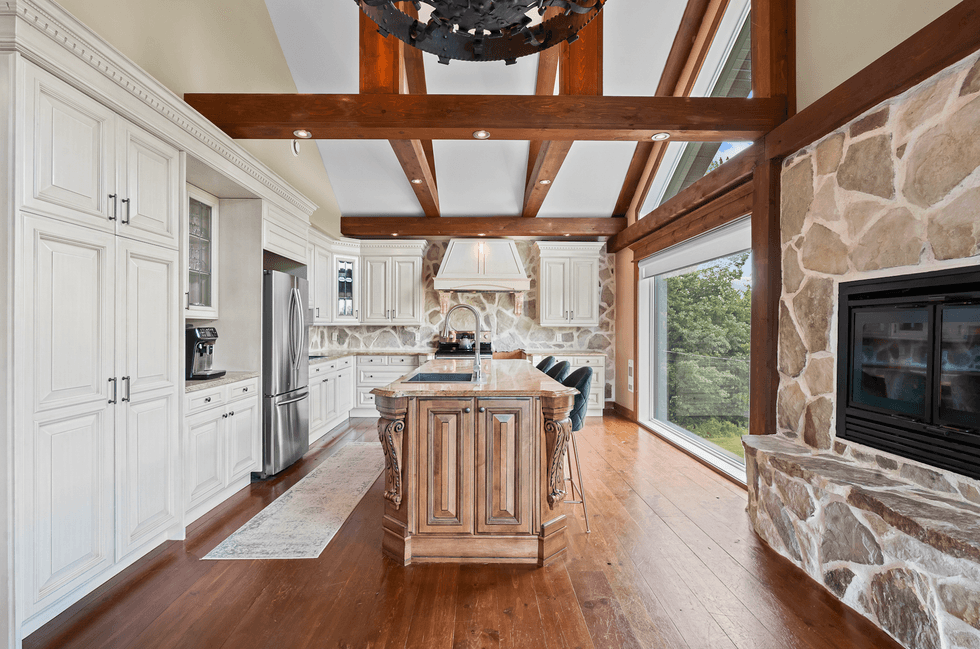 La cuisine propose une architecture chaleureuse et structurée, mise en valeur par des éléments qui renforcent le sentiment de fusion avec la nature. Les poutres apparentes en bois massif, le plancher de bois franc, l’îlot central en bois sculpté ainsi que le dosseret en pierre naturelle contribuent à créer une atmosphère à la fois authentique et accueillante.