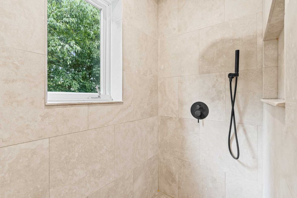 La douche, habillée de carreaux de pierre aux teintes naturelles, crée une ambiance qui rappelle un spa, accentuée par la robinetterie noire au style moderne.