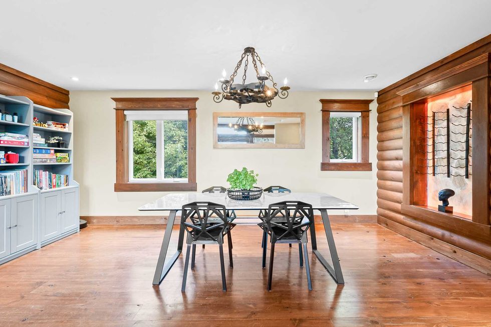 Adjacente à la cuisine, la salle à manger prolonge ce vibe très convivial. Le plancher de bois franc et les encadrements en bois massif confèrent à l’espace un cachet rustique intéressant.