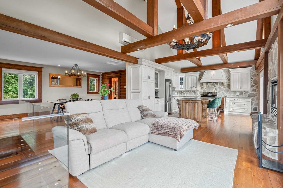 Le grand foyer en pierre naturelle devient instantanément le point focal de la pièce principale, créant une ambiance chaleureuse parfaite pour les soirées d'hiver dans les Laurentides.