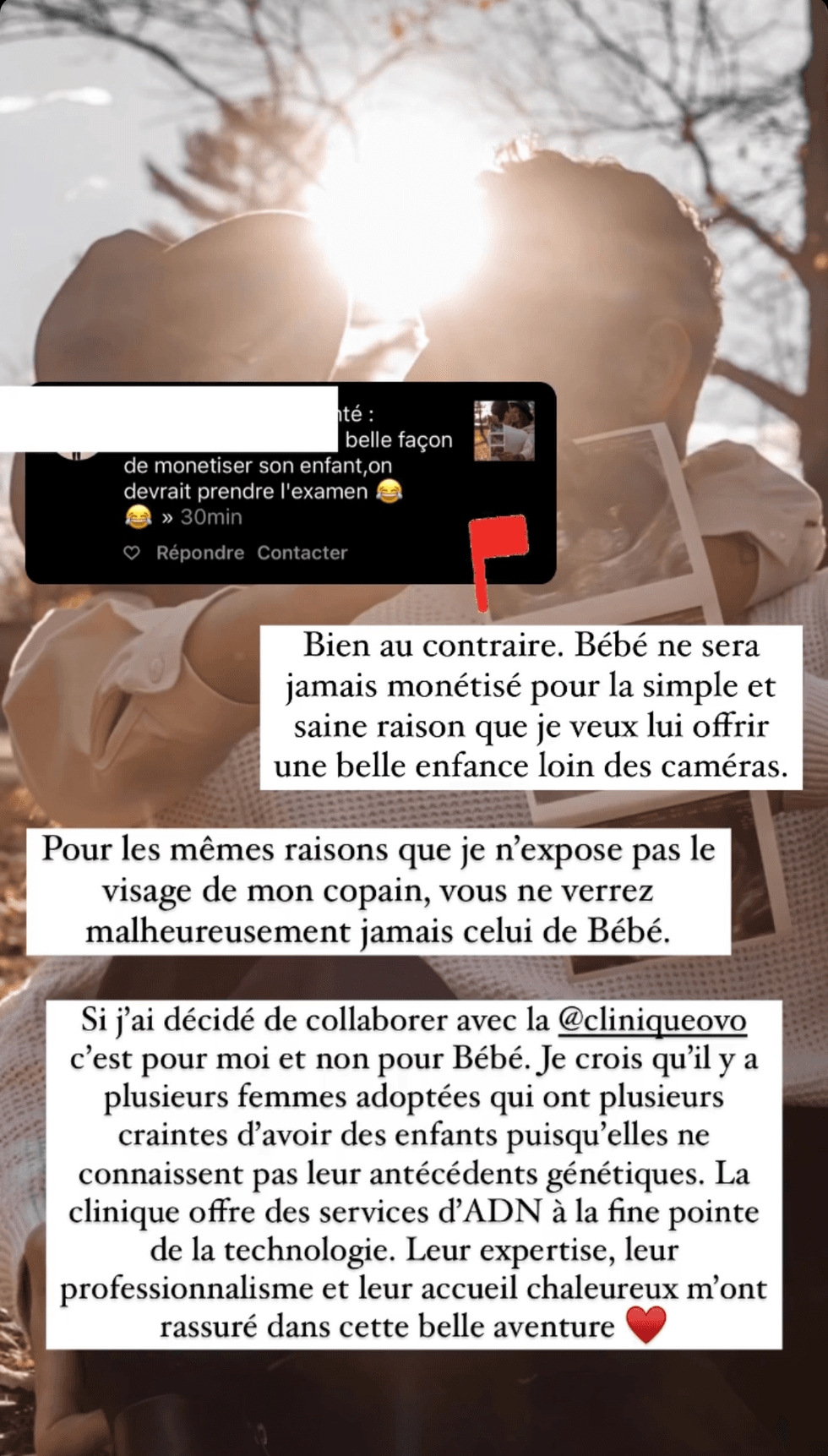 En story sur son compte Instagram, l'influenceuse a expliqué son choix en partageant un commentaire négatif qui disait que sa collaboration avec la Clinique OVO était une « belle façon de monétiser son enfant ». Les propos figuraient sous la série de photos dévoilant la venue de son premier enfant.