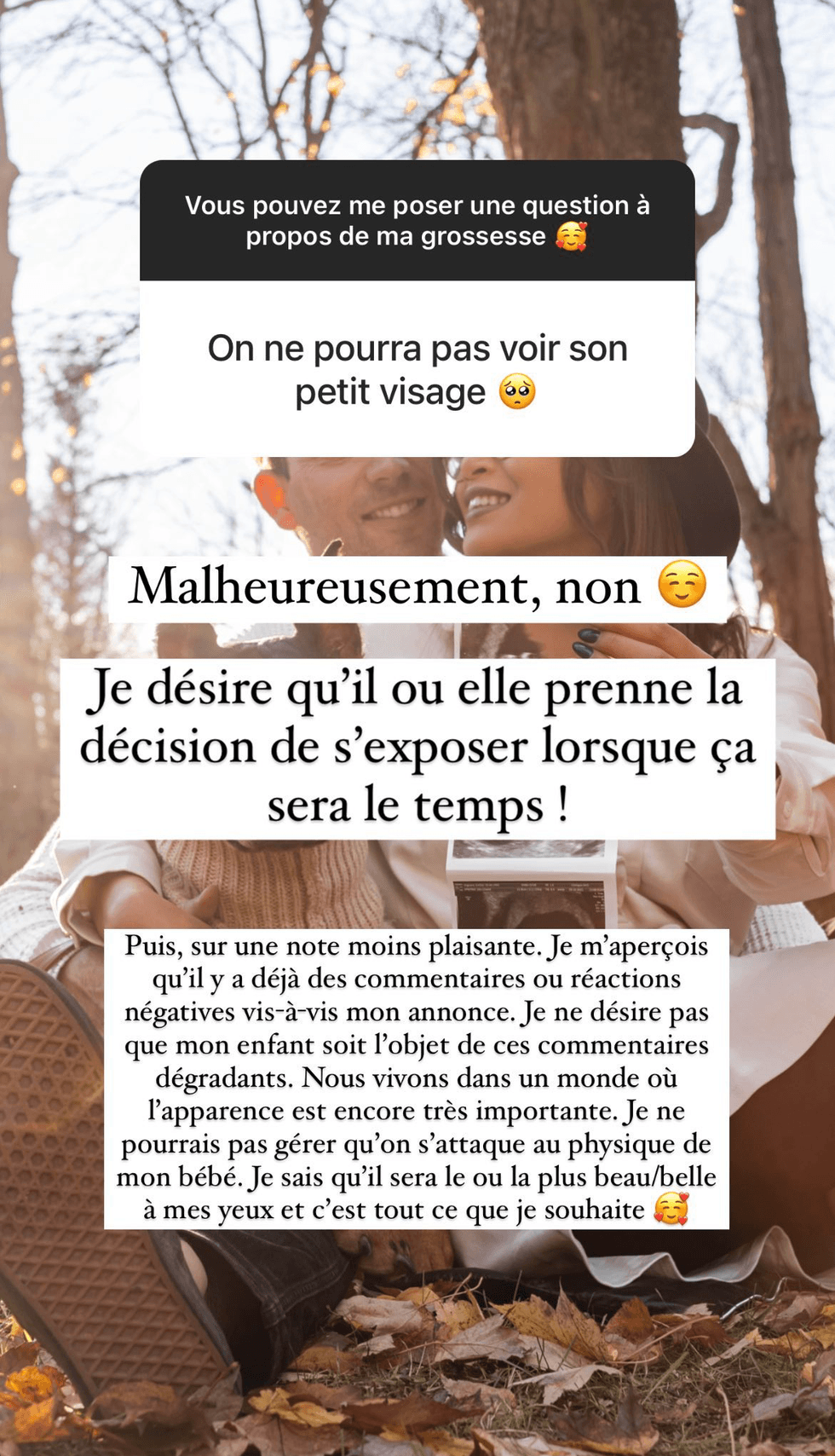 « Je m'aperçois qu'il y a déjà des commentaires ou réactions négatives vis-à-vis mon annonce. Je ne désire pas que mon enfant soit l'objet de ces commentaires dégradants, » ajoute-t-elle dans une seconde story sur le sujet.