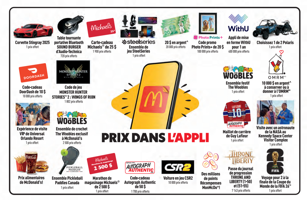 Parmi les récompenses à gagner, on retrouve des prix instantanés comme des hamburgers, des frites, des cafés, ainsi qu’une foule d’autres surprises : cartes-cadeaux, abonnements, montants en argent et bien plus encore.