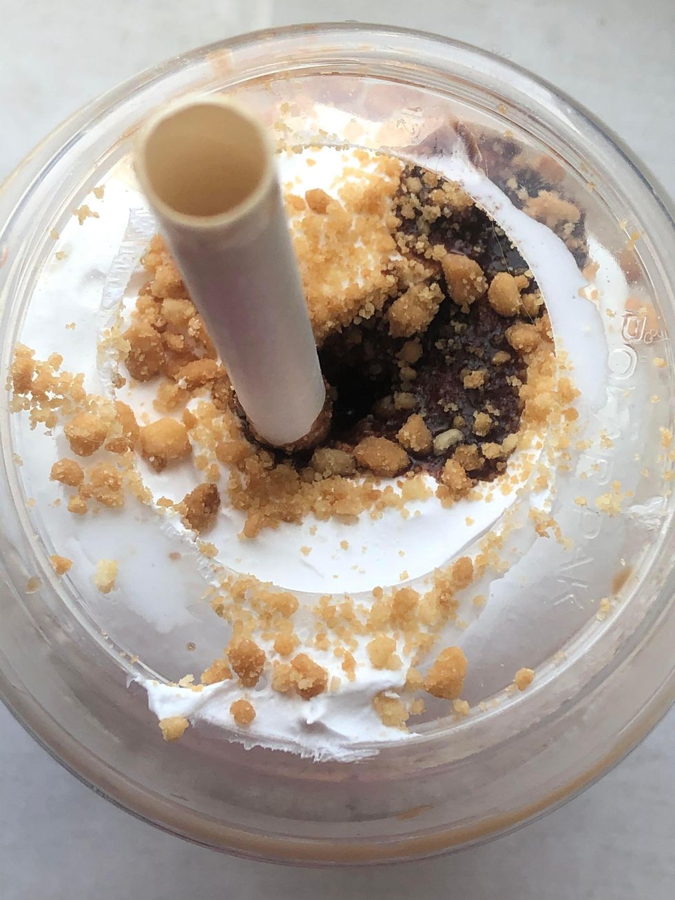 En d'autres mots, il s'agit d'un cappuccino glacé authentique, avec un jet de chocolat lancé au cœur d'une garniture à la guimauve qui s'apparente à de la crème fouettée, le tout est saupoudré de biscuits. C'est tellement moelleux que tu as l'impression de planter ta paille dans un gâteau, ce qui est assez impressionnant.