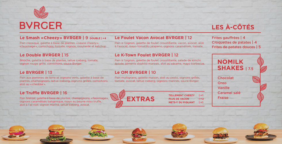 Au menu, tu auras le choix parmi sept sortes de burgers. Tu peux, entre autres, tester le classique BZRGER, avec une galette à base de plantes, des champignons, de la laitue iceberg, des oignons grillés et de l'aïoli au « cheddar » ou encore Le Foulet Vacon Avocat BVRGER avec une galette de « foulet » croustillante, du « vacon », de l'avocat, de l'aïoli à l'avocat, de la mayonnaise au jalapeño, des oignons caramélisés et des tomates.