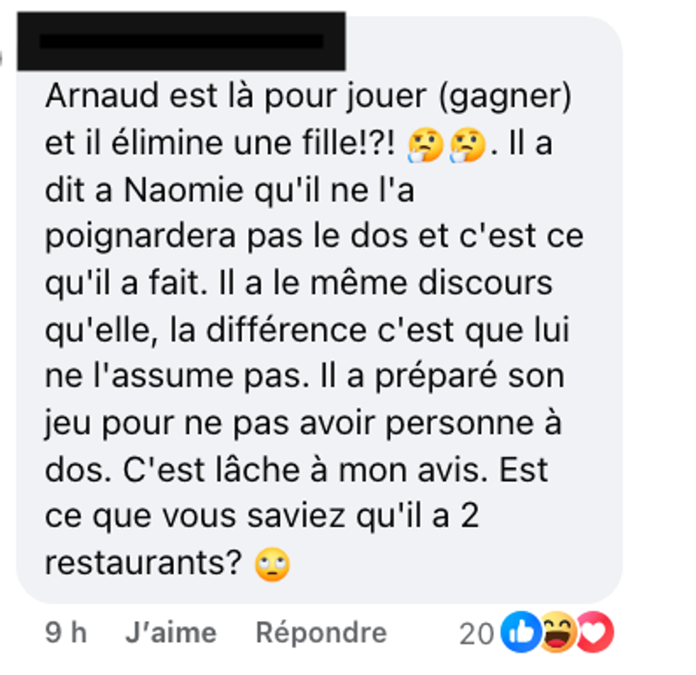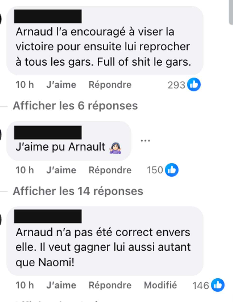 « Arnaud n’a pas été correct envers elle. Il veut gagner lui aussi autant que Naomi! », commente une téléspectatrice, qui a reçu 146 mentions « j’aime ».