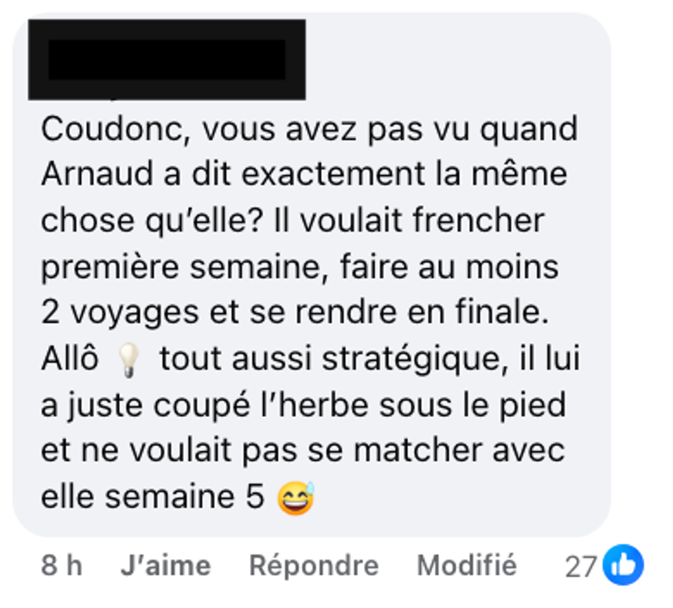 « Coudonc, vous avez pas vu quand Arnaud a dit exactement la même chose qu’elle? Il voulait frencher première semaine, faire au moins deux voyages et se rendre en finale. Allô. Tout aussi stratégique, il lui a juste coupé l’herbe sous le pied et ne voulait pas se matcher avec elle semaine 5. »