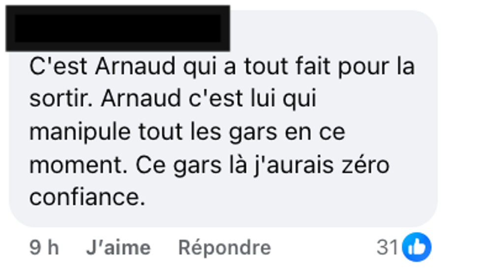 « C'est Arnaud qui a tout fait pour la sortir. Arnaud c'est lui qui manipule tous les gars en ce moment. Ce gars-là j'aurais zéro confiance. »