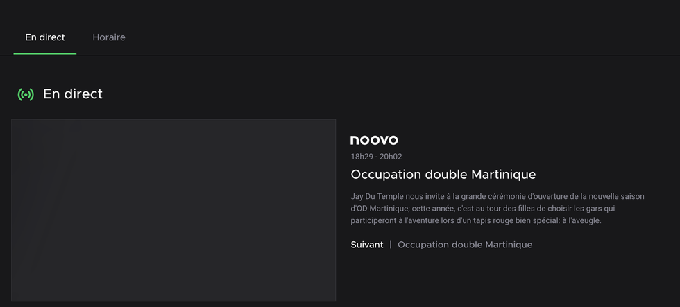 https://www.noovo.ca/en-directAlors que les Québécois.es attendaient avec impatience le tapis rouge d'Occupation Double Martinique du dimanche 18 septembre, certain.es ont dû patienter un peu plus longtemps en raison d'un bug sur Noovo. Des téléspectateur.trices n'ont pas réussi à visionner les cinq à dix premières minutes du début de l'épisode en direct.